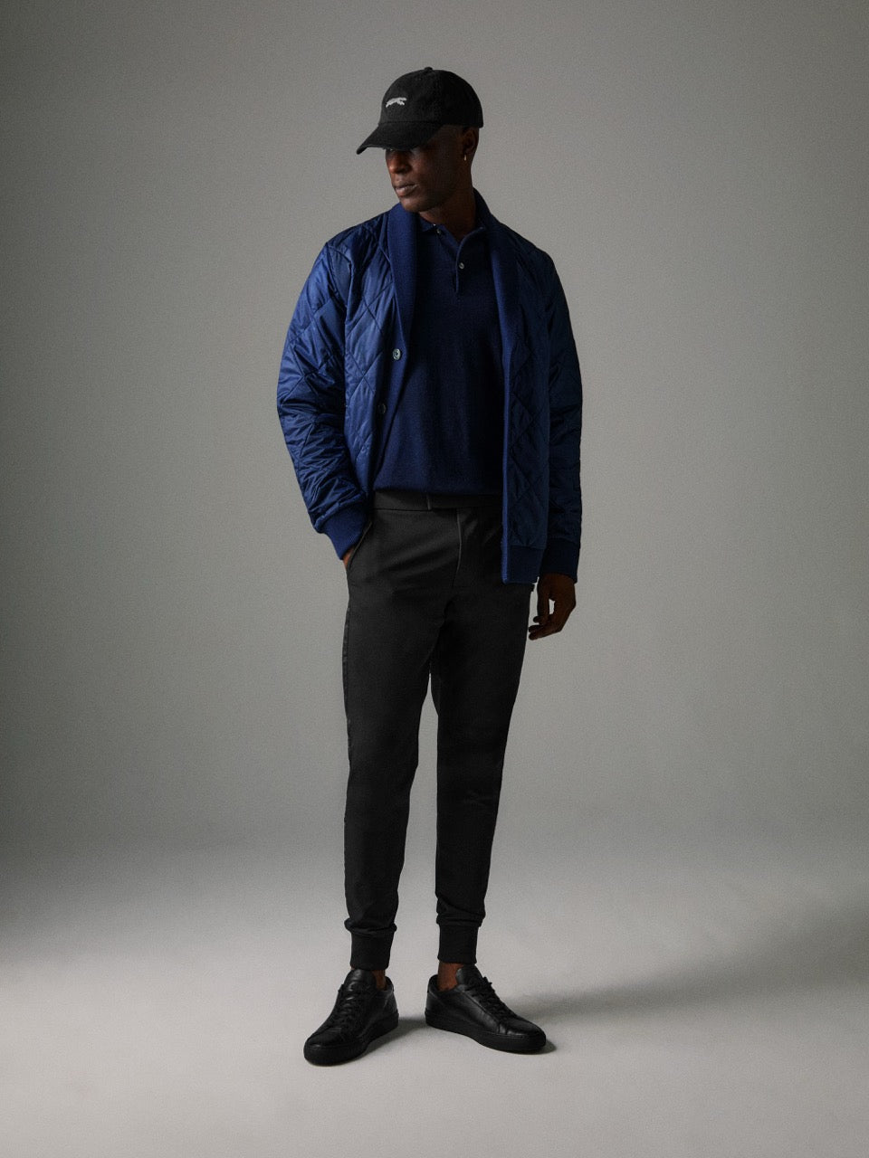 Products Displayed are the Yukon X-Lite Cardigan in Maltese Blue, the Saratoga Sweater Long Sleeve Polo in Maltese Blue, the Rumson Jogger in Shepherd, and the Running Wolf Dad Hat in Shepherd.