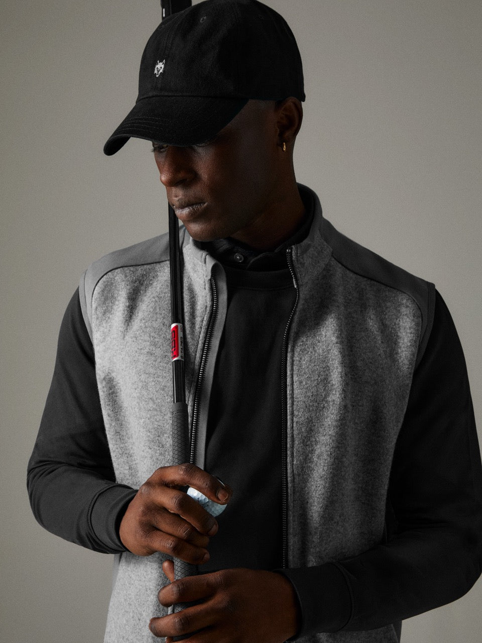 Products Displayed are the Omaha Long Sleeve Polo in Shepherd, the Siasconset Crewneck in Shepherd, the Sequoia Luxe Vest in Light Grey Heather, and the Icon Dad Hat in Shepherd.